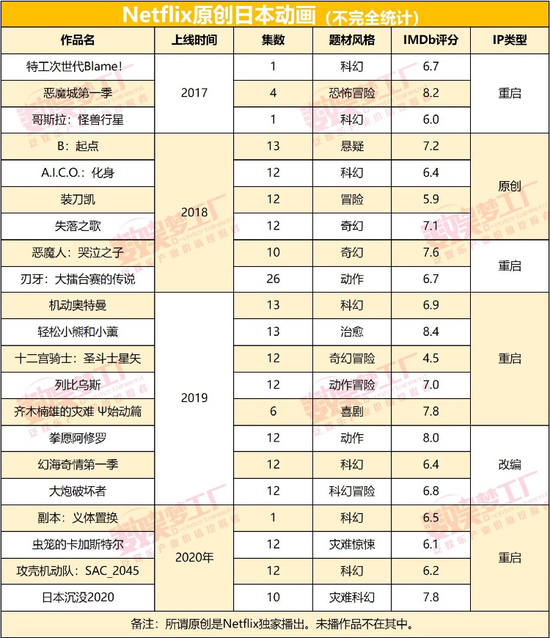 从数娱梦工厂的统计来看,2017年以来Netflix已经推出了超过20部原创日本动画,当中大部分是IP重启。