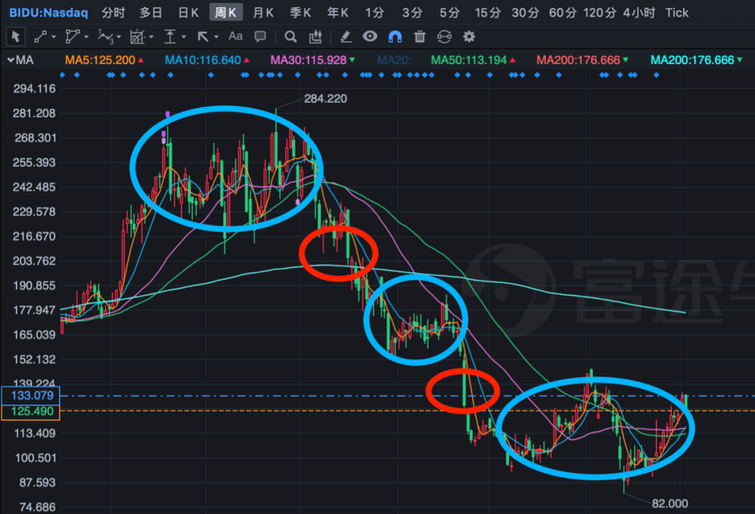 其实分析一家公司,最直观简单有效的方法就是从这家公司过去几年的股价走势上来看。我们从图中可以看到,百度的股价在过去3年明显分成了五个阶段: