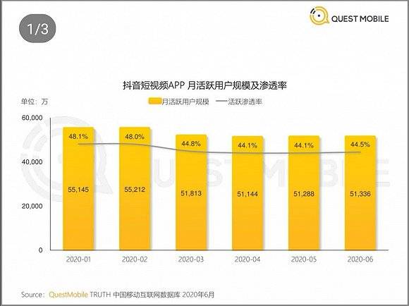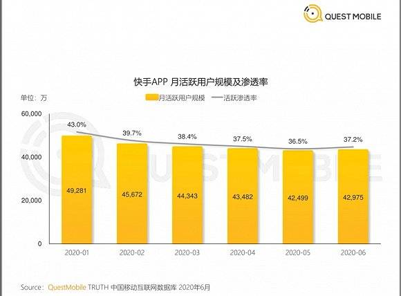 据第三方数据公司QuestMobile数据显示,最近三个月,抖音的DAU维持在5.1亿左右,渗透率在44%左右;因疫情因素,今年Q1季度,其DAU维持在5.5亿左右,渗透率峰值达到48%。与此同时,2020年Q1,快手的DAU维持在4.5亿左右,渗透率也在今年一月份创下43%的峰值,Q2季度基本保持在4.2亿,渗透率保持在37% 左右。