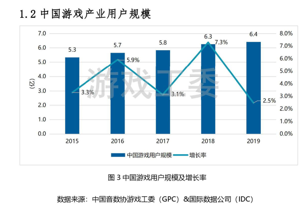 先看一下国内游戏市场的现状。虽然电竞在国内快速增长,但整个游戏市场规模特别是用户人数增速放缓已经是不争的事实。根据中国音像与数字出版协会发布的《2019年中国游戏产业报告》显示,2019年国内游戏用户规模达到了6.4亿人,同比近增长了2.5%。这一数字在2018年是6.26亿人(用户规模),同比的增幅则是7.3%。