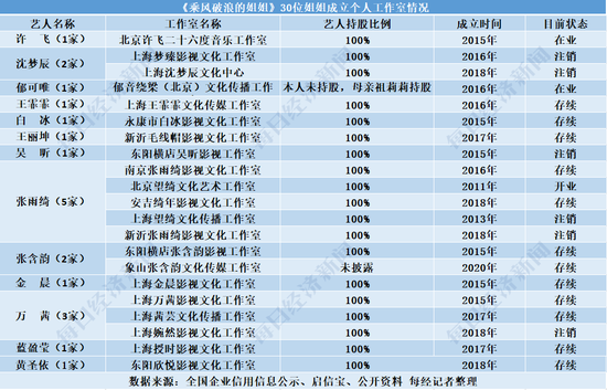 据每经记者不完全统计,30位姐姐中有13位姐姐成立了个人工作室,有的更是不止一家。许飞、郁可唯、王霏霏、白冰、王丽坤、吴昕、金晨、蓝盈莹、黄圣依均拥有1家个人工作室。这些姐姐们中,除郁可唯工作室是其母亲持股外,其他姐姐们都是自己100%持有工作室股份。
