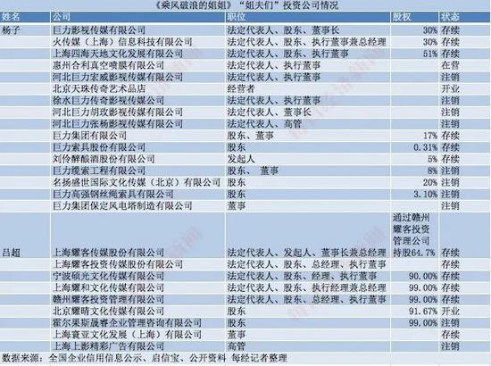 图片来源:《乘风破浪的姐姐》官方微博据不完全统计,从公司股权来看,30位姐姐中,只有6位姐姐涉及到了相关投资。投资“大户”当属黄圣依,主要投资范畴为影视文化,不过这主要受到了其老公杨子的影响。每经记者查询发现,黄圣依从2010年至今,投资出品了7部影视剧作品,包括电视剧《无间有爱》《水浒传》《第22条婚规》,电影《白蛇传说》《我在路上爱你》等。所以,姐姐们中并不只有张萌是影视制片人,黄圣依也是隐形霸主。