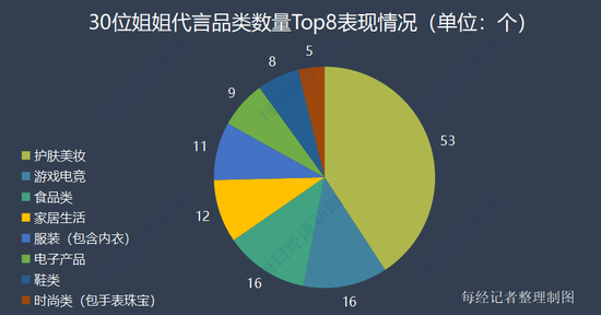 白冰、王丽坤、张萌、吴昕、张雨绮、黄圣依、张含韵代言情况具体来看,在超160个代言中,护肤美妆依旧是姐姐们选择最多、最偏好的领域,数量高达53个,占比超30%;游戏电竞类和食品类数量均16个,并列第二;家居生活类和服装则均超过了10个。这样数据趋势的呈现并非没有道理,毕竟对于女性明星而言,其良好的形象气质,在护肤美妆的代言领域具有不容忽视的优势。
