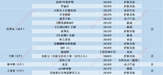 陈松伶、刘芸、海陆、王智、阿朵、钟丽缇、沈梦辰、宁静、郁可唯、王霏霏代言情况 点击图片可放大