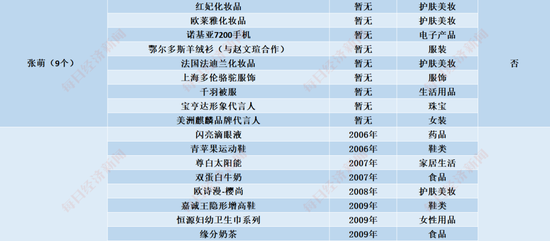 据每经记者通过公开资料不完全统计,30位姐姐中,除李斯丹妮、袁咏琳、黄龄、郑希怡、朱婧汐、丁当、许飞7位姐姐未查询到其代言情况外,其余23位姐姐共有超160款代言。