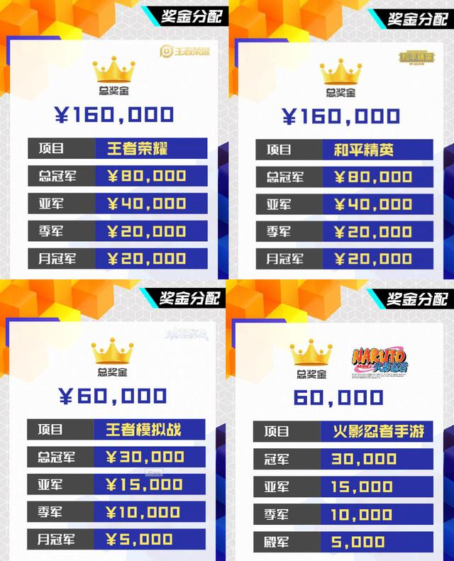 而本次比赛奖金丰厚,王者荣耀、和平精英占大头,包揽了16万的奖金,其中总冠军可以获得8万奖金。而王者荣耀模拟战以及火影手游的总冠军,也可以获得3万奖金。