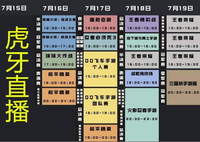 下面是总决赛的大致赛程,从16号到19号,赛程安排满满,总有一款能够满足大家。例如喜欢火影手游的小伙伴们,通过虎牙搜HMA,就可以在18号晚上观看到这项比赛的总决赛了。