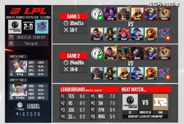 英雄联盟LPL夏季赛,在7月16日结束了两场“至关重要”的比赛,分别是由LNG迎战IG和RNG迎战SN 。虽然LNG已经失去了季后赛资格,但是由于IG和SN在此战之前,都是拿下了七个胜场,因此只要拿下各自的对手,IG和SN基本上就已经一只脚踏进了季后赛。