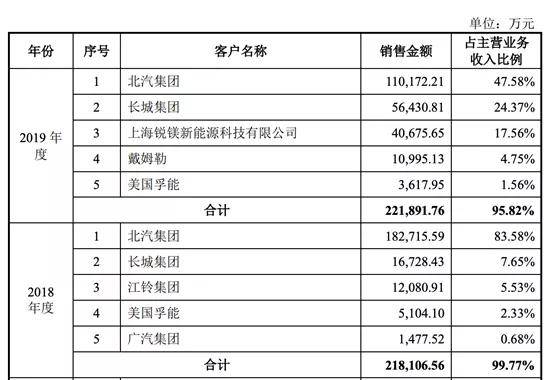 招股书里,孚能科技的第一大客户为北汽集团,2017年、2018年和2019年对其 销售收入占主营业务收入比重分别为87.57%、83.58%和47.58%。报告期内,孚能科技对前五大客户的销售收入占主营业务收入比重分别 99.78%、99.77%和95.82%。