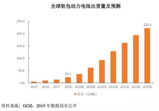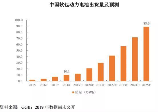 从出货量看,2018年中国软包动力电池出货量已达10.1GWh,同比增长48%。GGII预计到2025年,中国软包动力电池的出货量将达到88.6GWh。