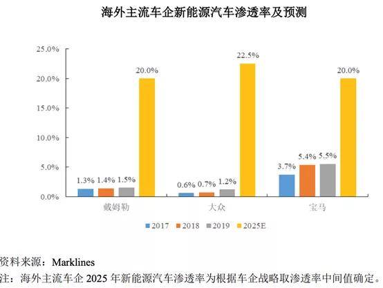 Marklines数据显示,2019年全球主流传统车企的新能源汽车渗透率平均已接近2%,到2025年新能源汽车平均渗透率将达到10%-15%左右。无疑,未来全球主流车企在新能源汽车领域的发力将成为新能源汽车产业发展的重要驱动因素之一。