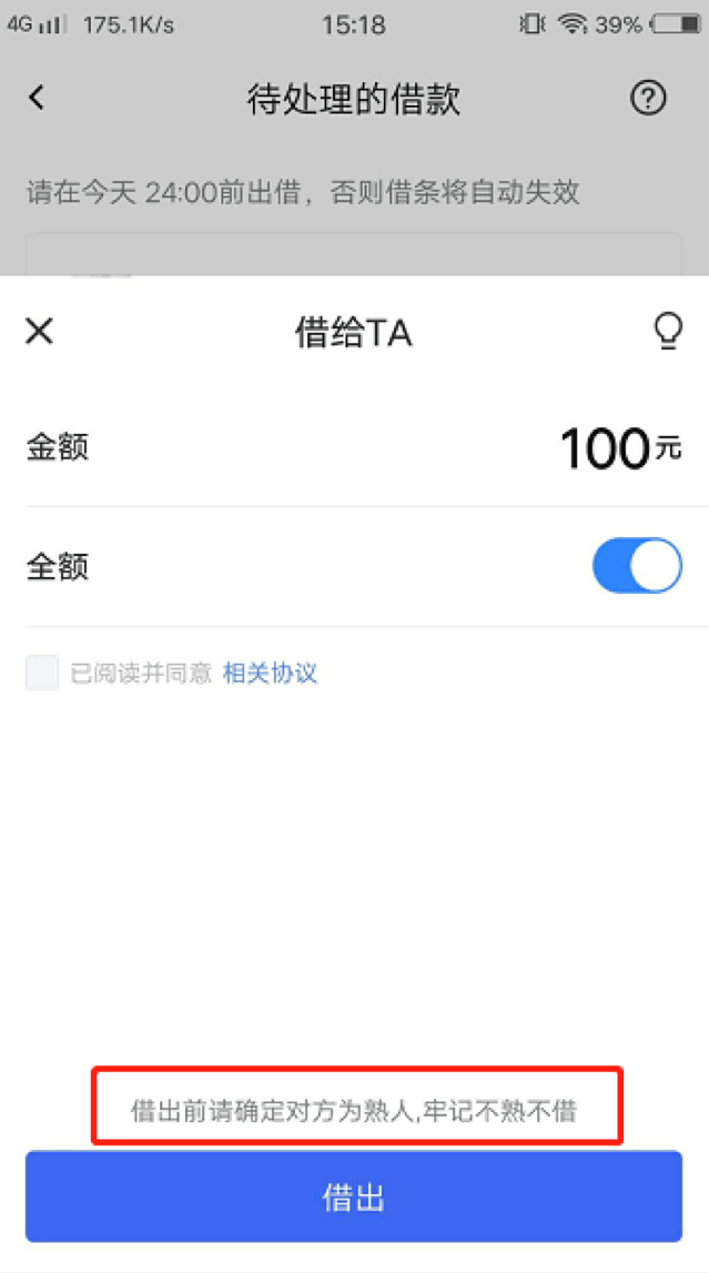 “借贷宝提供协议模板,双方自主填写条件后,以电子方式签名。用户自担借贷风险,借贷宝不对本息回收提供承诺或保证。签电子协议与纸质字据具有同等效力。”