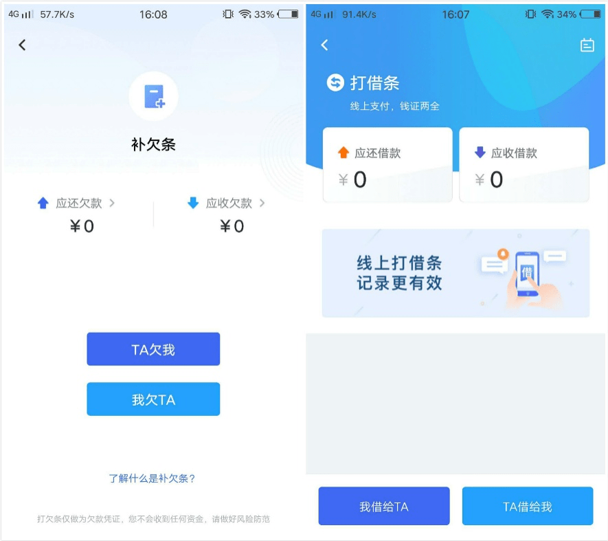 借条是基于特定的借款事实,表明债务人与债权人间的一种借款合同关系。欠条是债务人向债权人出具的表示尚欠某物或者某款项的凭证。记者分别点击进入“打借条”“补欠条”,两项功能的页面显示布局基本一致,如下图。可以看出,借贷双方应在交易之前就彼此认识,借贷宝只作登记工具而不提供借贷撮合服务。