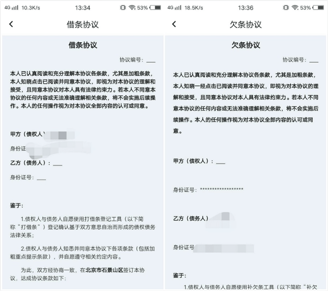 对此,借贷宝相关负责人说:“借款人和出借人在线下经协商就借贷金额、期限、利率等条件达成合意后,通过借贷宝打电子借条。而在线下已形成债权债务关系的双方通过借贷宝补电子欠条,关系形成原因为借贷、赊销等。借贷宝作为工具,为用户生成并保存电子合同。”