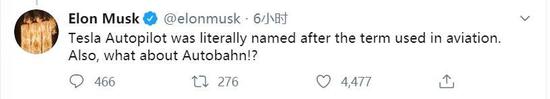 在推文中,马斯克表示:“特斯拉 Autopilot 是根据航天工业中使用的术语命名的,那AutoBahn(德国高速公路)怎么解释?