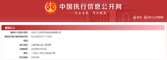 7月17日下午消息,天眼查数据显示,近日,北京人人车旧机动车经纪有限公司新增一条被执行人信息,执行法院为上海市宝山区人民法院,案号为(2020)沪0113执4647号,执行标的为1042180。