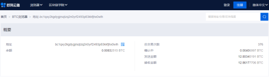 截至发稿,该钱包内的余额为 0.0083 BTC,在24小时内该地址共计进行376次交易,在该地址共计的交易中,目前有366笔交易向该地址转账比特币。