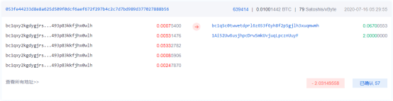 通过浏览器查询发现,黑客将12.85 BTC拆分成了5笔额度大于1 BTC的转账和若干笔额度不到1 BTC的的转账。这几笔额度大于1 BTC的转账分别为4.64 BTC、2.03 BTC、1.5BTC、1.24 BTC以及1.048 BTC。