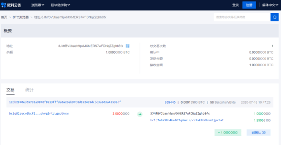 其次,继续追踪金额为3 BTC的交易地址(bc1q82sucw6kcf2rlklg8myf2fpkrg0rtduguddyxw),它被继续拆分至交易地址3JMfBVJbaeh9pxMXMERS7wFDNqZZghb8fx(1 BTC)和交易地址bc1q7u0s59n4ke8d7qdmmlnpcx4xk9ddhnmtjpxtat(1.99 BTC)。