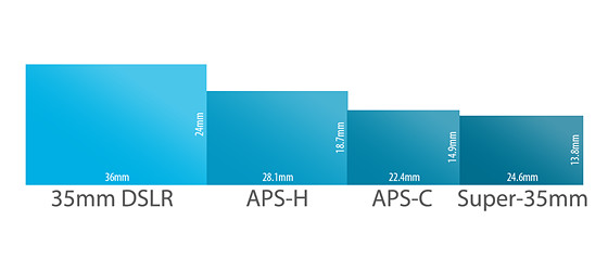 不同规格的传感器大小对比,左到右是全幅、两种残幅和Super 35