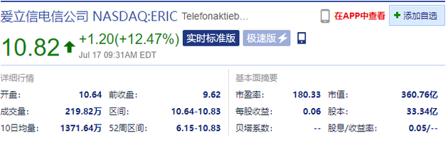 7月17日晚间消息,爱立信开盘涨10.6%,报10.64美元,当前市值360.76亿美元。