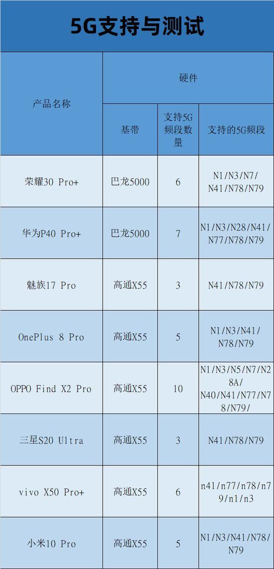 不过即使是基带上大抵相同,但是因为天线设计和不同厂商之间的取舍问题。各个手机对于5G频段的支持情况各不相同。其中表现最好的是OPPO Find X2 Pro、华为P40 Pro+以及荣耀30 Pro+、vivo X50 Pro+四款。