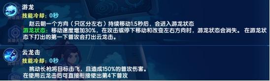 赵云持续移动会大大提高移动速度,同时第一次普攻会打出云龙击,可将敌人击飞。击飞敌人后,赵云的技能或普攻都可进行衔接连招。