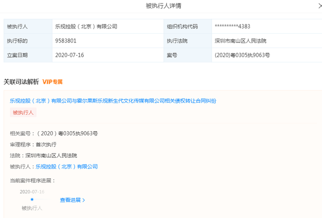 7月18日上午消息,天眼查数据显示,乐视控股(北京)有限公司因与霍尔果斯乐视新生代文化传媒有限公司相关债权转让合同纠纷被深圳市南山区人民法院列为被执行人,案号为(2020)粤0305执9063号,执行标的为9583801元。