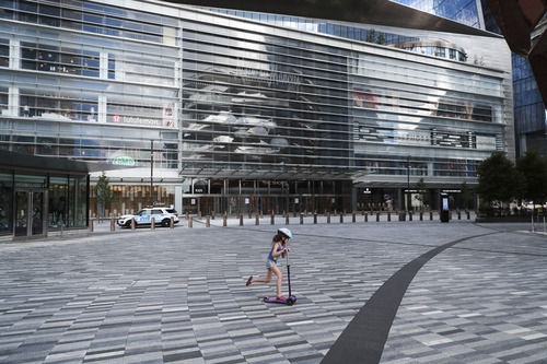7月14日,在美国纽约一家尚未恢复店内购物的购物中心外,一名女孩在空旷的广场上玩耍。新华社记者王迎摄