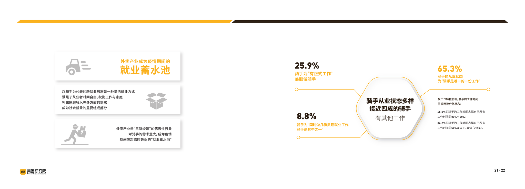 除此之外,在数字经济平台推动下,零工经济正改变着传统工作方式,给就业带来更多可能性。2020上半年,美团平台上近四成骑手有其他工作,其中8.8%的骑手拥有不止一份灵活就业工作。