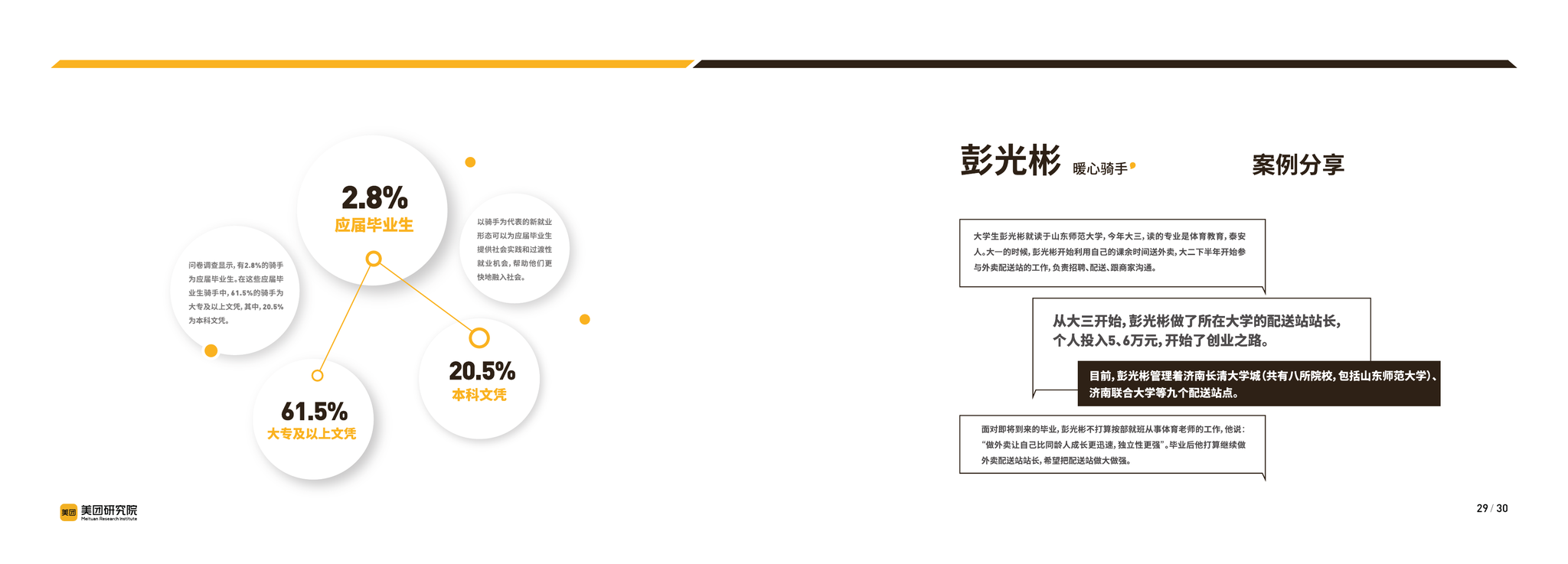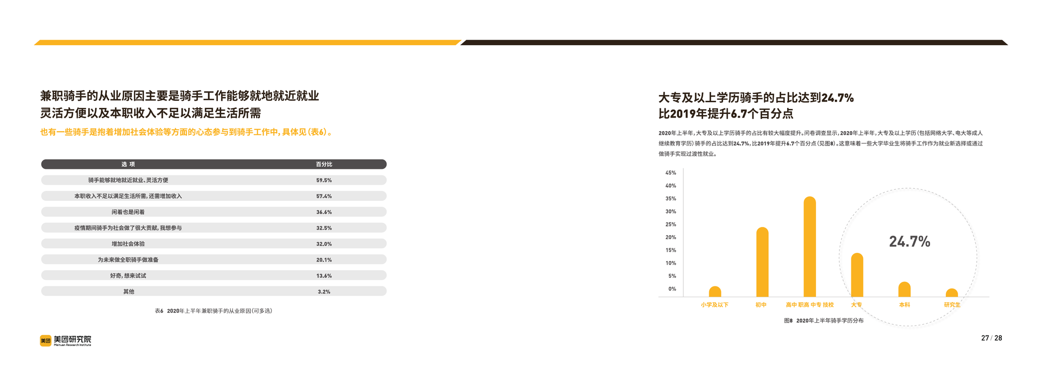 值得一提的是,90后骑手占据近半壁江山,成为骑手主力,其中大专及以上学历骑手占比达24.7%(包括网络大学、电大等成人继续教育学历)。以骑手为代表的新就业形态为大学生提供了社会实践和过渡性就业机会,帮助他们更快地融入社会。