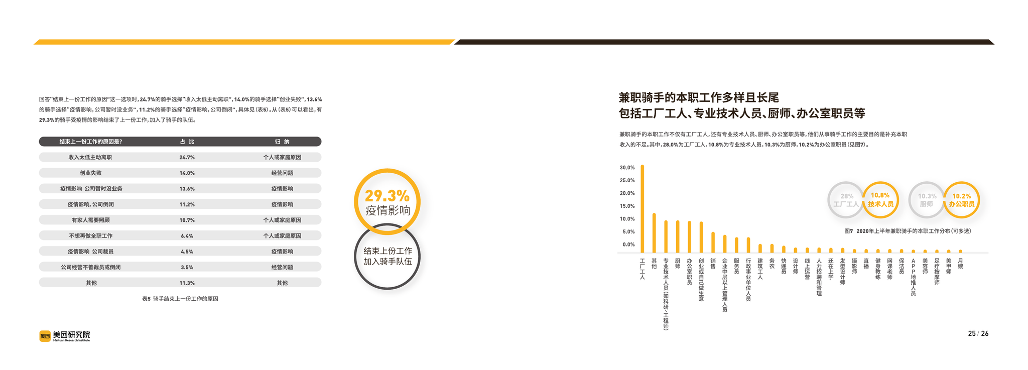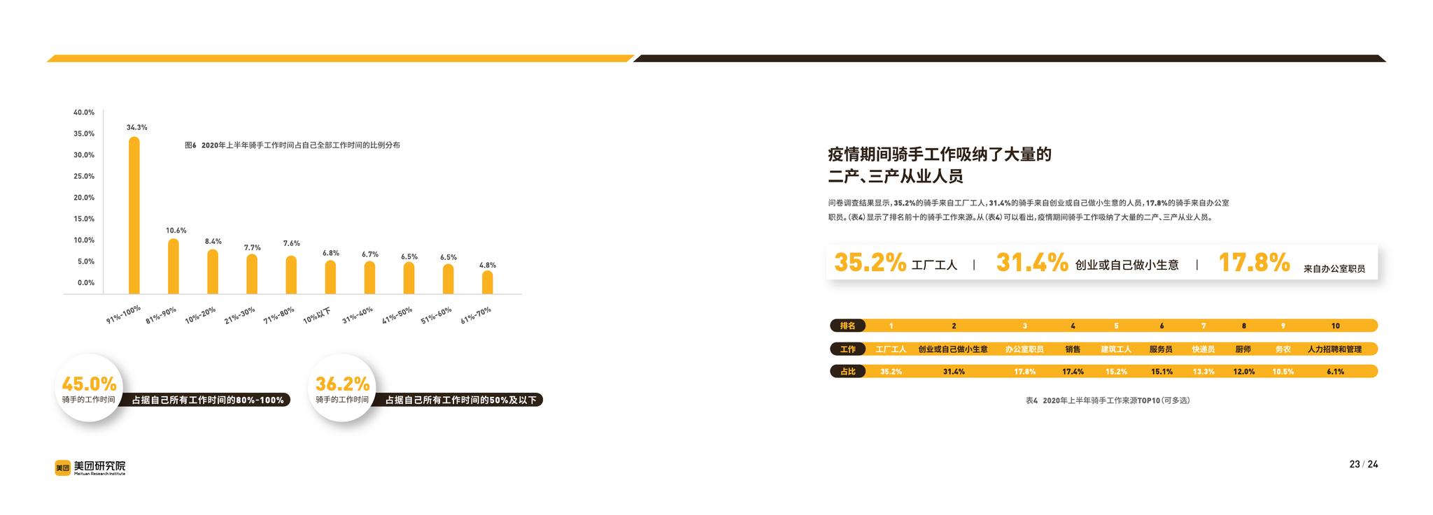 报告显示,疫情期间骑手工作吸纳了大量二产、三产从业人员。其中,35.2%的骑手曾是工厂工人,31.4%曾是创业或自己做小生意的人员。