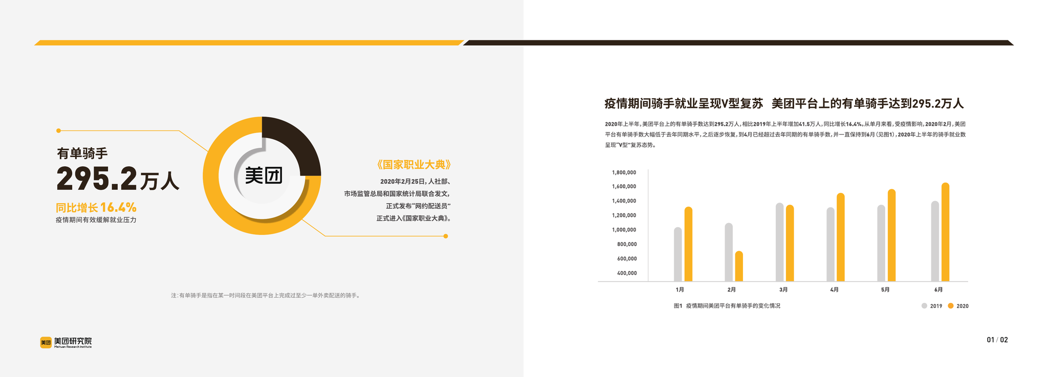 报告显示,2020年上半年,美团平台上的有单骑手数达到295.2万人,同比增长16.4%,整体就业数呈现“V型”复苏态势。尽管受疫情影响,仍有近五成骑手每月可获得4000元以上收入。
