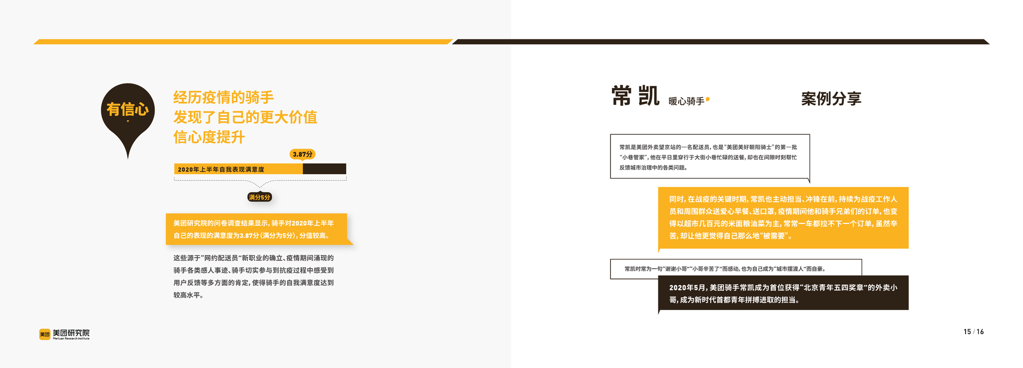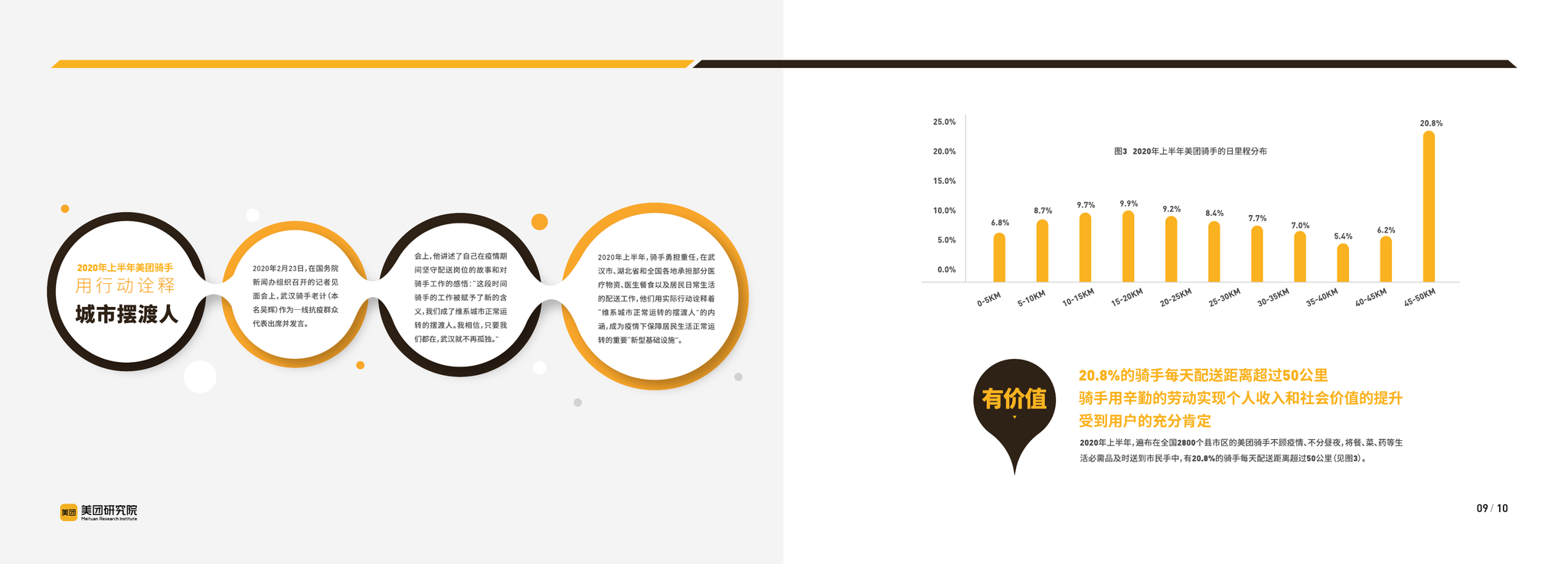 2020年上半年,遍布在全国2800个县市区的美团骑手不顾疫情、不分昼夜,将餐、菜、药等生活必需品及时送到市民手中,有20.8%的骑手每天配送距离超过50公里。骑手的辛勤劳动逐渐让用户了解到骑手工作更深层次的意义。疫情期间很多用户通过加骑手微信发红包、向骑手赠送口罩、为骑手买奶茶等行动表达对骑手的敬意和感谢。