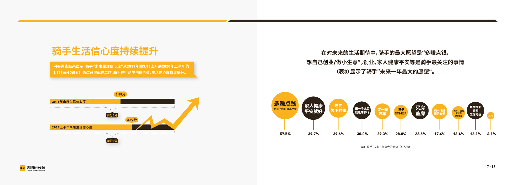 报告同时显示,骑手“未来生活信心度”也从2019年的3.88上升到2020年上半年的3.97(满分为5分)。对于未来,多数骑手的最大愿望是“多赚点钱,想自己创业/做小生意”、“家人健康平安就好”;也有不少人向往一场甜甜的恋爱、一次说走就走的旅行……