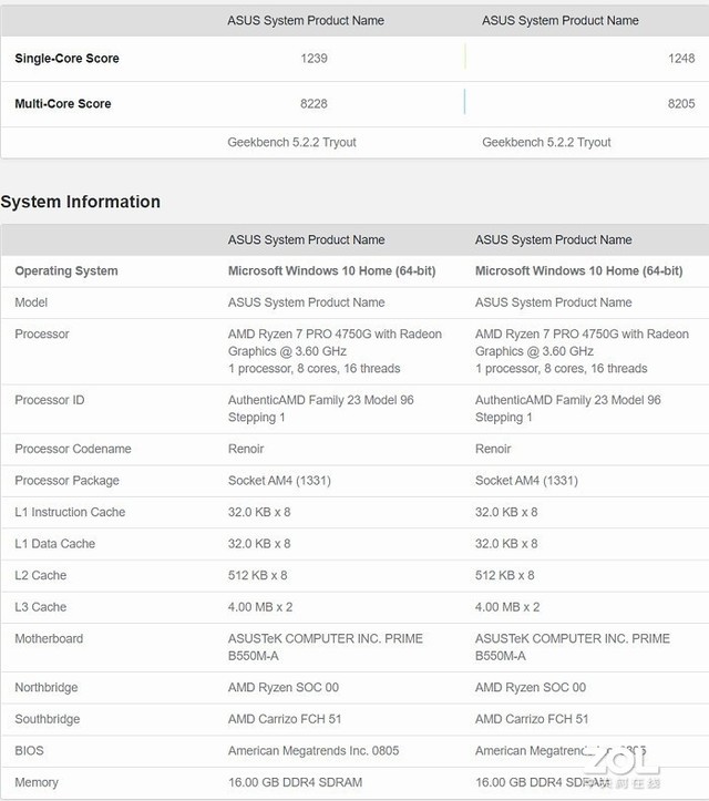 APU终于要来了,如今一款型号为锐龙7 PRO 4750G的跑分成绩出现在了Geekbench数据库中。数据库有两组,其中一组的多核成绩为8228,单核成绩为1239;另一组的多核成绩为8205,单核成绩为1248。两组成绩差距不大,基本可以算是误差。