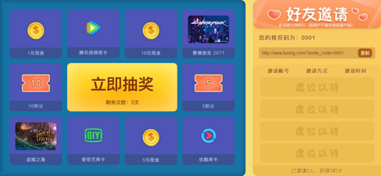 活动期间邀请新用户越多,抽奖机会越多,100%中奖!邀请的新用户首次在流星客户端扫码登录即为邀请成功。需要注意的是,活动页面抽奖机会仅限在活动期间使用,逾期清空作废,请广大玩家及时进行抽奖!中奖的玩家可在每周六9:00-17:30期间凭兑奖码联系流星小妹进行兑换,其中获得现金奖励的玩家累计满20元即可提现。
