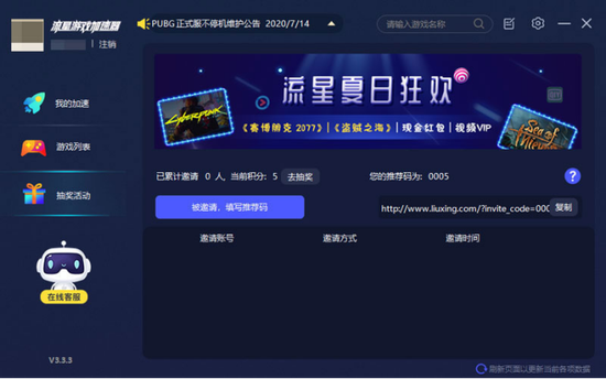 流星加速器的新老用户均可参与,首次进入活动页面即可抽奖3次,成功通过邀请链接邀请1名好友注册再获得1次抽奖机会,单用户每天最高可获得50次抽奖机会。流星夏日狂欢节已于2020年7月18日开启,热门游戏、现金奖励等待你的领取!