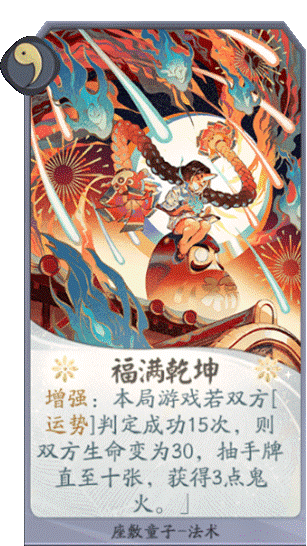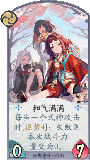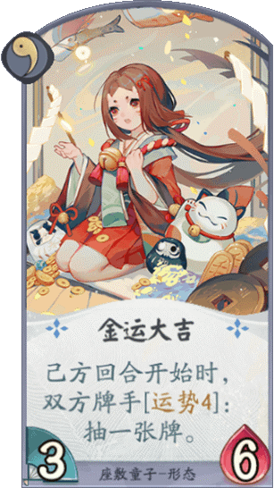 座敷童子还拥有恢复牌手生命、眩晕攻击牌手的式神等多种有趣的卡牌,甚至还能够凭借“福满乾坤”卡牌,在双方运势判定成功15次时将双方牌手的生命全部恢复到初始状态重新开局。座敷童子的卡牌效果对双方都有效,运气足够好的时候座敷童子可以通过运势影响整个牌局的节奏,帮助牌手平安度过前中期。也因为她所有的卡牌都与运势相关,所以经常与同样是靠掷骰子打出局势的山兔配合,当山兔三级形态获得“萌即正义”后,就可以只投出点数为“6”的骰子,配合座敷童子的运势判定,不仅可以让对方牌友气得直呼“欧皇”挫败对方锐气,还能够有效的拉长战斗节奏,帮助慢速卡组成长过渡到后期,一举两得。
