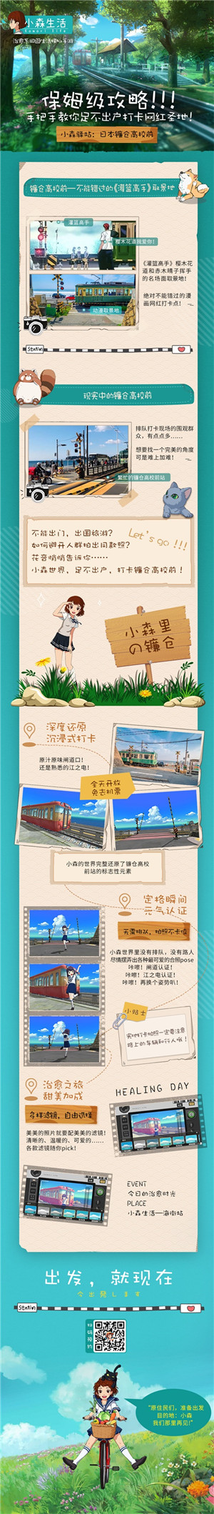 无论是宁静安逸的日系村庄,还是充满神秘气息的古老神社,甚至是樱木和晴子挥手的镰仓高校前的车站,你都可以在小森寻得踪迹!今天第一站,让导游“花音”带你一起去海街车站打卡,重温那让人难以忘记的热血青春~