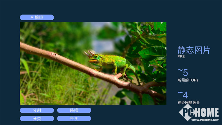 但在AI加入进行处理后,我们可以发现照片效果经过了显著的提升。首先是画面表现更佳清晰,AI进行了主体检测,并成功的将拍照主体与背景分离,形成了十分自然的背景虚化效果,让座位拍照主体的蜥蜴更为突出。在画面色彩的表现上,AI处理之下明显让人感到更漂亮了,画面的饱和度更高,绿叶部分更为鲜艳,阳光照射区域在HDR处理器也有了更加丰富的细节表现。显然这张照片的表现力明显胜过普通的静态照片拍照,但是它也需要足够的AI算力支持才能获得这样的效果,大约5TOPs的算力才能达到运算需求。