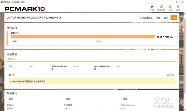 续航方面,联想YOGA 14s内置了60.7Wh电池,容量可观。实测在屏幕亮度为151nits(亮度71%)、连接Wi-Fi、Windows电源模式为更长的续航、Fn+Q切换至智能模式,使用PCMark 10的现代办公模式进行续航测试,最终得到16小时7分钟,非常夸张,旗舰水平。联想YOGA 14s配备Type-C接口PD电源适配器,支持快充,官方称充电一刻钟,可使用两个小时。