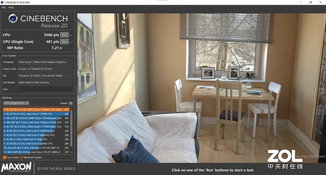 首先是理论性能测试,实测Cinebench R15多核1518cb、单核182cb;Cinebench R20多核3466pts、单核481pts。理论测试成绩还是相当给力的,比自家锐龙5 4600H还要高一些。同样定位“7”级别,锐龙7 4800U的理论性能可比竞品高多了。