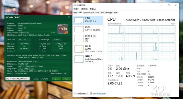 锐龙7 4800U,基于Zen 2架构,采用台积电7nm。拥有8核心16线程,基础频率1.8GHz,单核最大加速频率为4.2GHz,三级缓存8MB,默认TDP为15W,cTDP为10-25W(YOGA 14s所实现的还要高)。内置的显卡核心数量为8个(Vega 8),显卡频率为1750MHz。