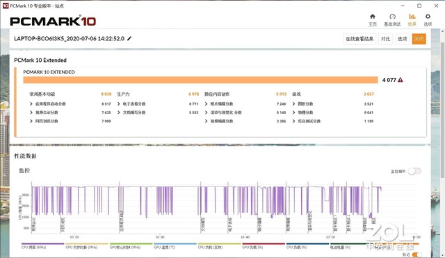 最后是整机性能,实测PCMark 10 Extended模式下总分4077,其中常用基本功能得分8038、生产力得分6978、数位内容创作得分5013、游戏得分2657。从子项得分来看,联想YOGA 14s可以满足办公、娱乐及轻度游戏需求。