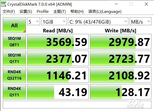 硬盘方面,联想YOGA 14s采用了容量为512GB PCIe3.0×4 SSD,实测在队列数=8、线程数=1时,持续读取3569MB/s、持续写入2979MB/s;队列数=1、线程数=1时,4K随机读取43.19MB/s、4K随机写入128.17MB/s。理论成绩为PCIe3.0×4 SSD的旗舰水平。另外联想YOGA 14s内部还预留了一个2242 M.2硬盘位,支持硬盘扩展,这在目前的轻薄本中比较少见。