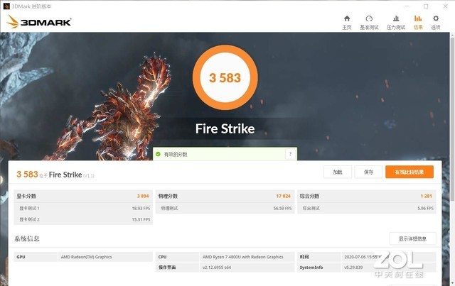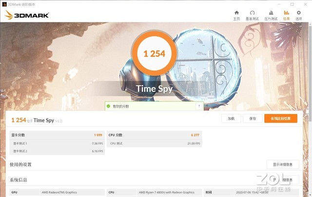 显卡方面,Vega 8的综合表现还是很给力的。实测3DMark Time Spy模式下总分1254、显卡分1099;Fire Strike模式下总分3583、显卡分3894。理论成绩还是很给力的,已经与满血MX250打的有来有回。