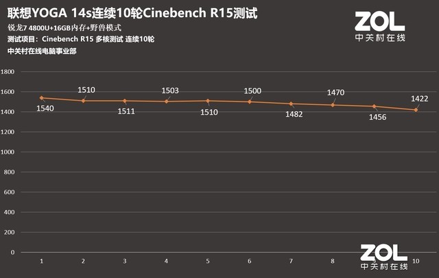 当然,联想YOGA 14s也不是一直保持如此强劲的CPU释放。从多轮Cinebench R15多核成绩的结果来看,其多核成绩会出现平滑下降,最终稳定在1390cb左右。即使如此,该理论成绩也已经是同价位轻薄本的佼佼者。