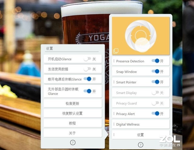 提到人脸识别,联想YOGA 14s内置了软件Glance by Mirametrix。这是一款可以通过红外摄像头监测用户使用状态,从而提供相应功能的软件。个人认为比较实用的功能是,人离开后,红外摄像头监测到人脸消失,从而自动锁屏;监测到人脸时,自动亮屏并通过人脸识别登陆系统。如果外接显示器(仅笔记本屏幕+显示器双屏),还可以实现智能指针(当人脸向另一个屏幕转动,指针自动出现在另一个屏幕上)、窗口分屏(单击选中窗口,当人脸向另一个屏幕转动,窗口自动出现在另一个屏幕上)等功能。我简单体验了一下,反应比较迅速,体验不错。