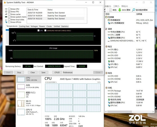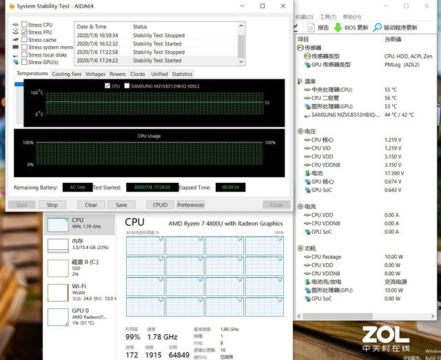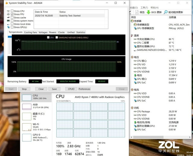 接下来是CPU压力测试,使用AIDA64系统稳定性测试程序,勾选Stress FPU,测试时长30分钟。最终锐龙7 4800U的功耗稳定在28W、全核频率为2.8GHz、核心温度86°左右。从各项数据来看,性能释放很不错了。很明显,联想YOGA 14s没有那么激进(当然这是相比较联想小新Pro 13锐龙版而言),该设定应该是为了兼顾温度、噪音、性能等方面。